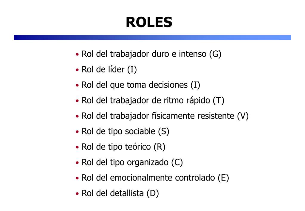 ROLES • Rol del trabajador duro e intenso (G) • Rol de líder (I) • Rol del que toma decisiones (I) • Rol del trabajador de ritmo rápido (T) • Rol del trabajador físicamente resistente (V) • Rol de tipo sociable (S) • Rol de tipo teórico (R) • Rol del tipo organizado (C) • Rol del emocionalmente controlado (E) • Rol del detallista (D)