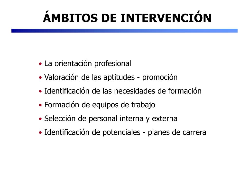 ÁMBITOS DE INTERVENCIÓN • La orientación profesional • Valoración de las aptitudes - promoción • Identificación de las necesidades de formación • Formación de equipos de trabajo • Selección de personal interna y externa • Identificación de potenciales - planes de carrera