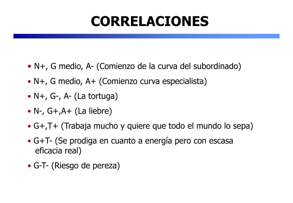 CORRELACIONES • N+, G medio, A- (Comienzo de la curva del subordinado) • N+, G medio, A+ (Comienzo curva especialista) • N+, G-, A- (La tortuga) • N-, G+,A+ (La liebre) • G+,T+ (Trabaja mucho y quiere que todo el mundo lo sepa) • G+T- (Se prodiga en cuanto a energía pero con escasa eficacia real) • G-T- (Riesgo de pereza)