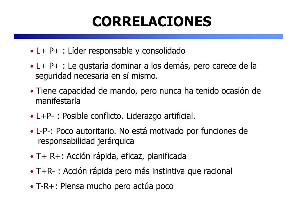 CORRELACIONES • L+ P+ : Líder responsable y consolidado • L+ P+ : Le gustaría dominar a los demás, pero carece de la seguridad necesaria en sí mismo. • Tiene capacidad de mando, pero nunca ha tenido ocasión de manifestarla • L+P- : Posible conflicto. Liderazgo artificial. • L-P-: Poco autoritario. No está motivado por funciones de responsabilidad jerárquica • T+ R+: Acción rápida, eficaz, planificada • T+R- : Acción rápida pero más instintiva que racional • T-R+: Piensa mucho pero actúa poco