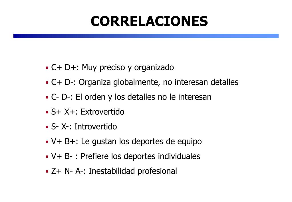 CORRELACIONES • C+ D+: Muy preciso y organizado • C+ D-: Organiza globalmente, no interesan detalles • C- D-: El orden y los detalles no le interesan • S+ X+: Extrovertido • S- X-: Introvertido • V+ B+: Le gustan los deportes de equipo • V+ B- : Prefiere los deportes individuales • Z+ N- A-: Inestabilidad profesional