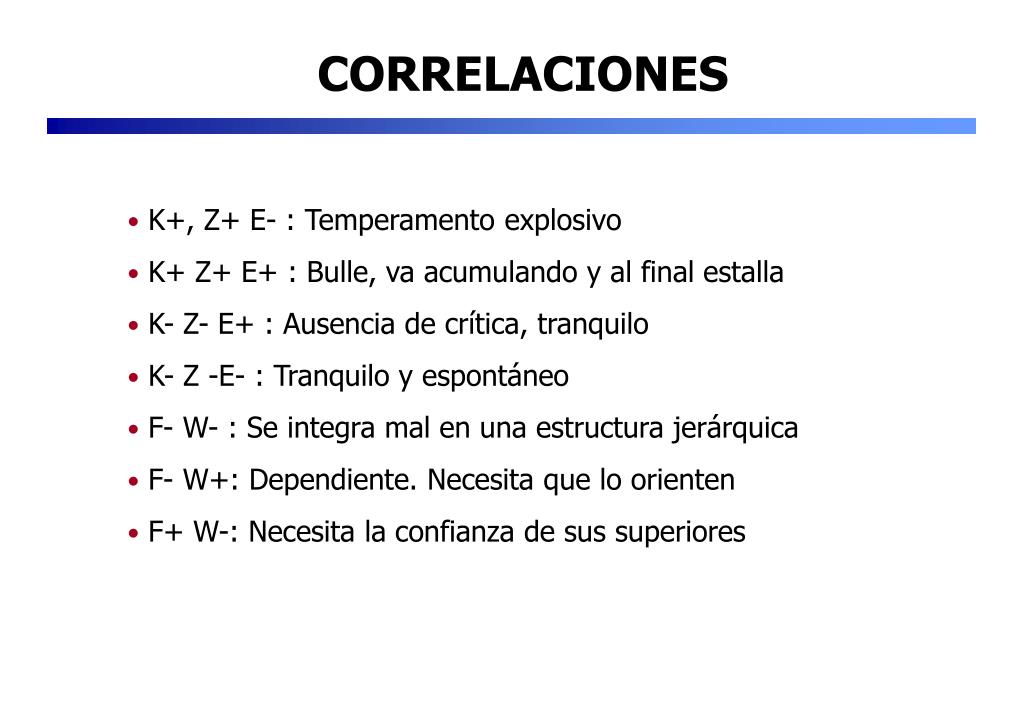 CORRELACIONES • K+, Z+ E- : Temperamento explosivo • K+ Z+ E+ : Bulle, va acumulando y al final estalla • K- Z- E+ : Ausencia de crítica, tranquilo • K- Z -E- : Tranquilo y espontáneo • F- W- : Se integra mal en una estructura jerárquica • F- W+: Dependiente. Necesita que lo orienten • F+ W-: Necesita la confianza de sus superiores