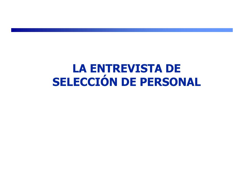 PELIGROS QUE DEBEN SER EVITADOS EN LA ENTREVISTA DE SELECCIÓN • El efecto de “halo”: dejándose impresionar, positiva o negativamente por determinada circunstancia del candidato y extendiendo esa impresión a los demás aspectos. Ej: presencia personal. • Prejuicios: Falta de objetividad, ideas preconcebidas. Ej: Petulante por hablar con el cigarro en la boca, provocativa por entrecruzar las piernas (mujer) • Estereotipos: Ejecutivo dinámico, empleado celoso, vendedor eficiente, son imágenes que el entrevistador puede tener en su mente comparando inconscientemente con este tipo ideal al candidato.