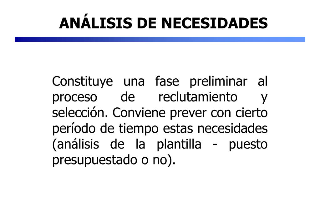 ANÁLISIS DE NECESIDADES Constituye una fase preliminar al proceso de reclutamiento y selección. Conviene prever con cierto período de tiempo estas necesidades (análisis de la plantilla - puesto presupuestado o no).