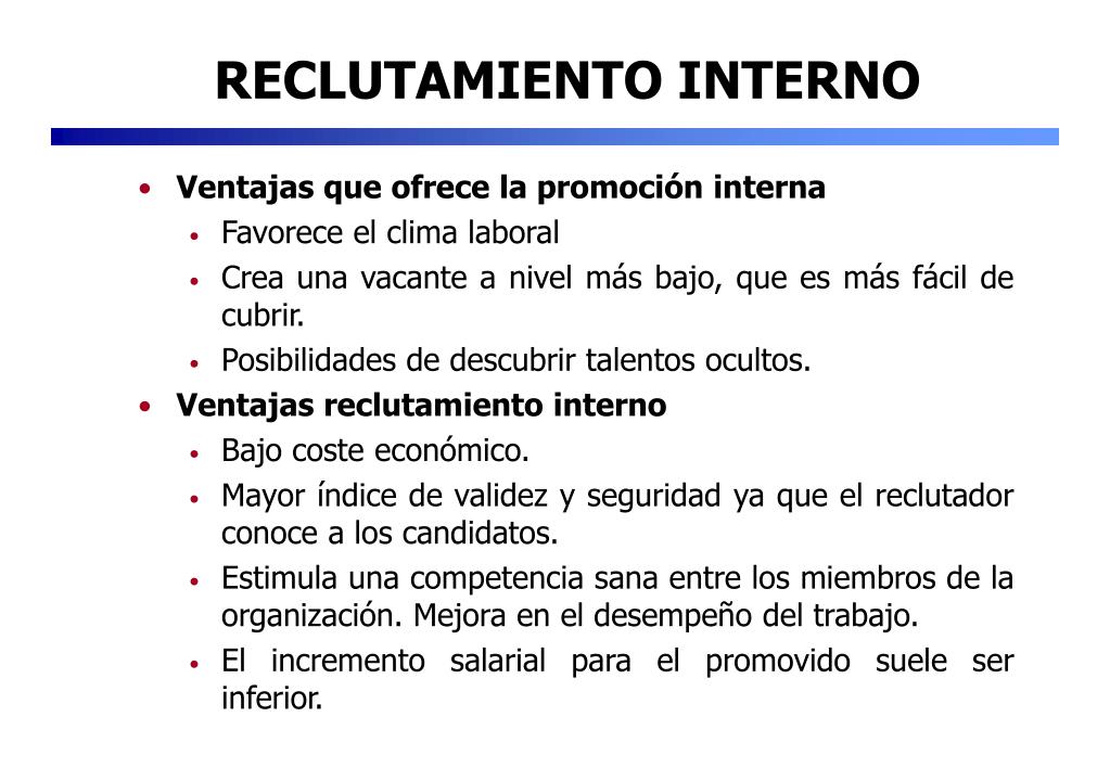 RECLUTAMIENTO INTERNO • Ventajas que ofrece la promoción interna • Favorece el clima laboral • Crea una vacante a nivel más bajo, que es más fácil de cubrir. • Posibilidades de descubrir talentos ocultos. • Ventajas reclutamiento interno • Bajo coste económico. • Mayor índice de validez y seguridad ya que el reclutador conoce a los candidatos. • Estimula una competencia sana entre los miembros de la organización. Mejora en el desempeño del trabajo. • El incremento salarial para el promovido suele ser inferior.