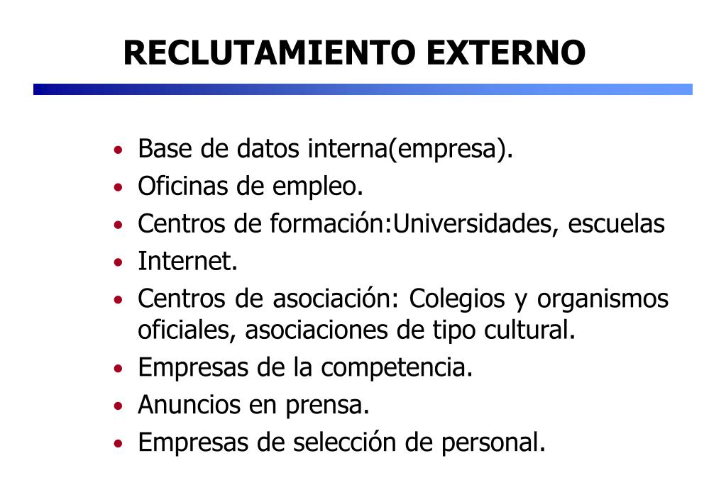 RECLUTAMIENTO EXTERNO • Base de datos interna(empresa). • Oficinas de empleo. • Centros de formación:Universidades, escuelas • Internet. • Centros de asociación: Colegios y organismos oficiales, asociaciones de tipo cultural. • Empresas de la competencia. • Anuncios en prensa. • Empresas de selección de personal.