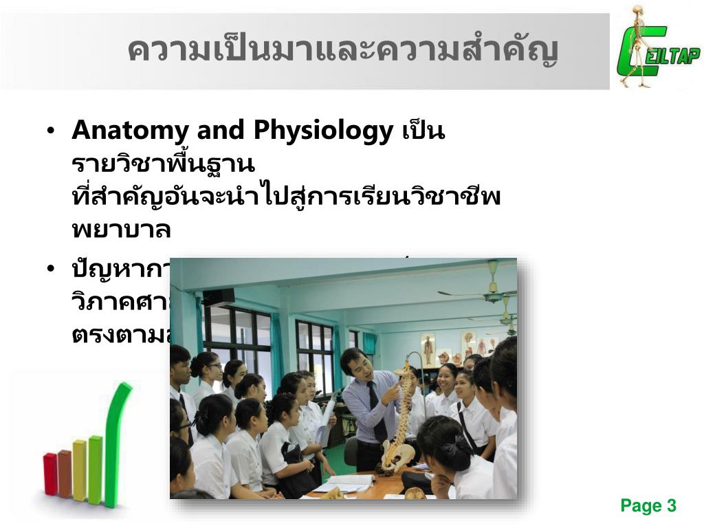 ความเป็นมาและความสำคัญ • Anatomy and Physiology เป็นรายวิชาพื้นฐานที่สำคัญอันจะนำไปสู่การเรียนวิชาชีพพยาบาล • ปัญหาการขาดแคลนอาจารย์สอนกายวิภาคศาสตร์และสรีรวิทยา ที่มีคุณวุฒิตรงตามสาขา
