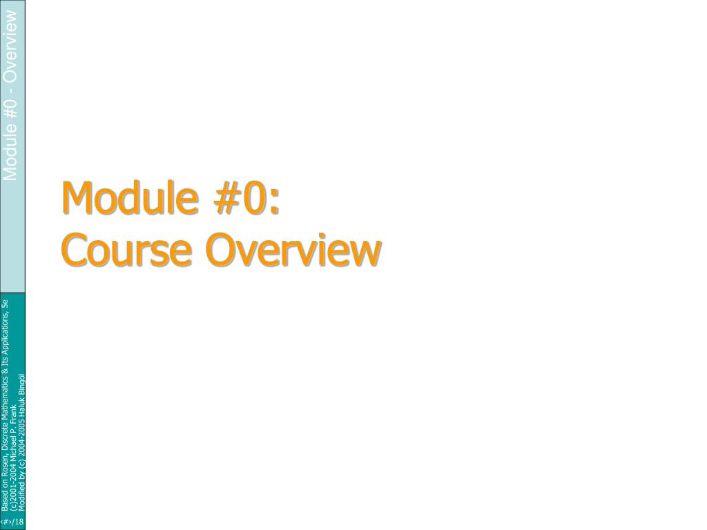 Michael Frank’s slides adapted • We’re not using all his lectures • Various changes in those that we use • Possibly some new lectures • Your key resources • Course’s web page • Ken Rosen’s book • http://www.mhhe.com/math/advmath/rosen/r5