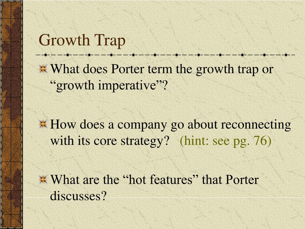 Growth Trap • What does Porter term the growth trap or “growth imperative”? • How does a company go about reconnecting with its core strategy? (hint: see pg. 76) • What are the “hot features” that Porter discusses?