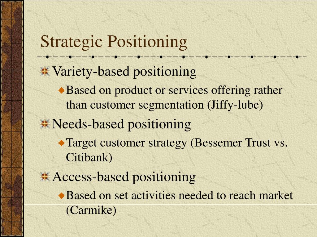 Strategic Positioning • Variety-based positioning • Based on product or services offering rather than customer segmentation (Jiffy-lube) • Needs-based positioning • Target customer strategy (Bessemer Trust vs. Citibank) • Access-based positioning • Based on set activities needed to reach market (Carmike)