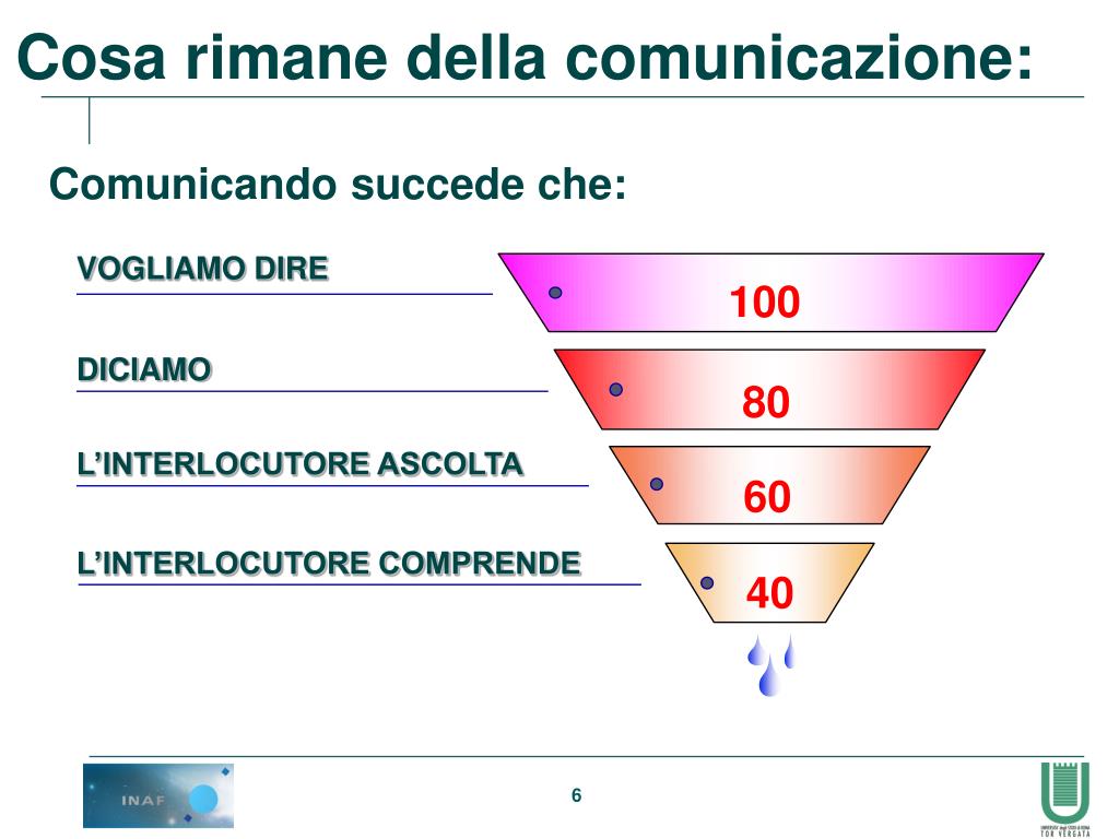 Cosa rimane della comunicazione: Comunicando succede che: VOGLIAMO DIRE 100 DICIAMO 80 L’INTERLOCUTORE ASCOLTA 60 L’INTERLOCUTORE COMPRENDE 40