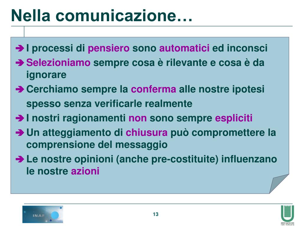 Nella comunicazione… • I processi di pensiero sono automatici ed inconsci • Selezioniamo sempre cosa è rilevante e cosa è da ignorare • Cerchiamo sempre la conferma alle nostre ipotesi spesso senza verificarle realmente • I nostri ragionamenti non sono sempre espliciti • Un atteggiamento di chiusura può compromettere la comprensione del messaggio • Le nostre opinioni (anche pre-costituite) influenzano le nostre azioni
