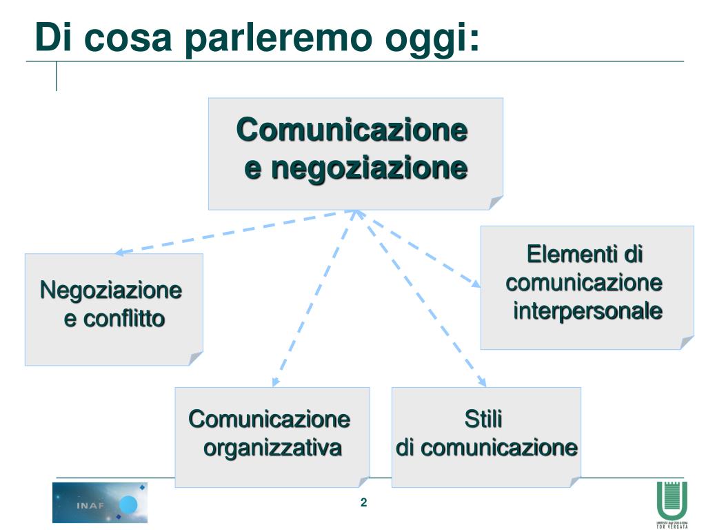 Comunicazione e negoziazione. Di cosa parleremo oggi:. Comunicazione e negoziazione. Elementi di comunicazione interpersonale. Negoziazione e conflitto. Comunicazione organizzativa. Stili di comunicazione. ELEMENTI DI COMUNICAZIONE INTERPERSONALE.