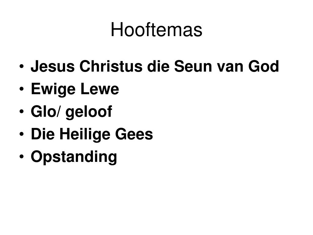 Hooftemas • Jesus Christus die Seun van God • Ewige Lewe • Glo/ geloof • Die Heilige Gees • Opstanding