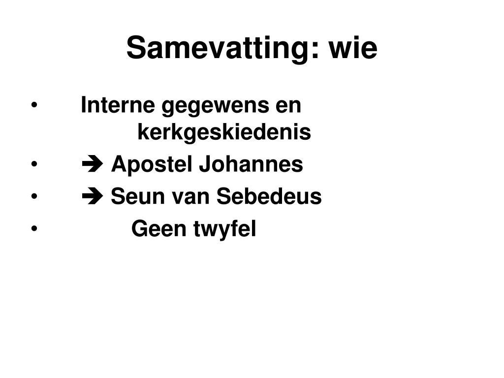 Samevatting: wie • Interne gegewens en kerkgeskiedenis • Apostel Johannes • Seun van Sebedeus • Geen twyfel