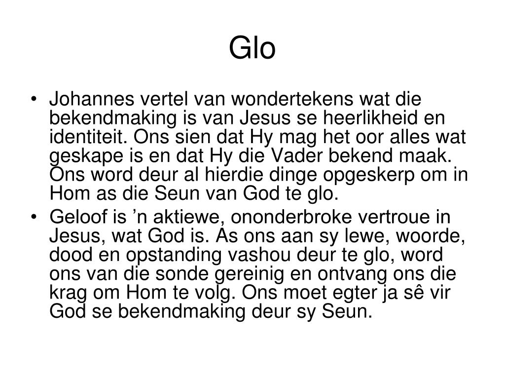 Glo • Johannes vertel van wondertekens wat die bekendmaking is van Jesus se heerlikheid en identiteit. Ons sien dat Hy mag het oor alles wat geskape is en dat Hy die Vader bekend maak. Ons word deur al hierdie dinge opgeskerp om in Hom as die Seun van God te glo. • Geloof is ’n aktiewe, ononderbroke vertroue in Jesus, wat God is. As ons aan sy lewe, woorde, dood en opstanding vashou deur te glo, word ons van die sonde gereinig en ontvang ons die krag om Hom te volg. Ons moet egter ja sê vir God se bekendmaking deur sy Seun.