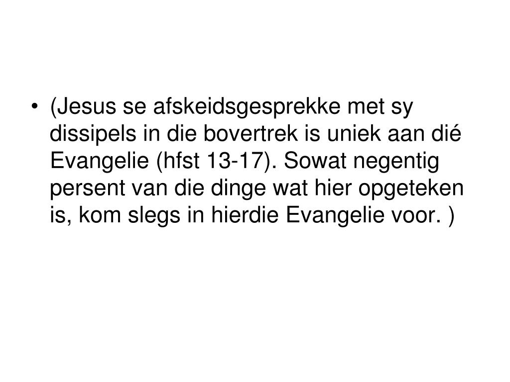 (Jesus se afskeidsgesprekke met sy dissipels in die bovertrek is uniek aan dié Evangelie (hfst 13-17). Sowat negentig persent van die dinge wat hier opgeteken is, kom slegs in hierdie Evangelie voor. )