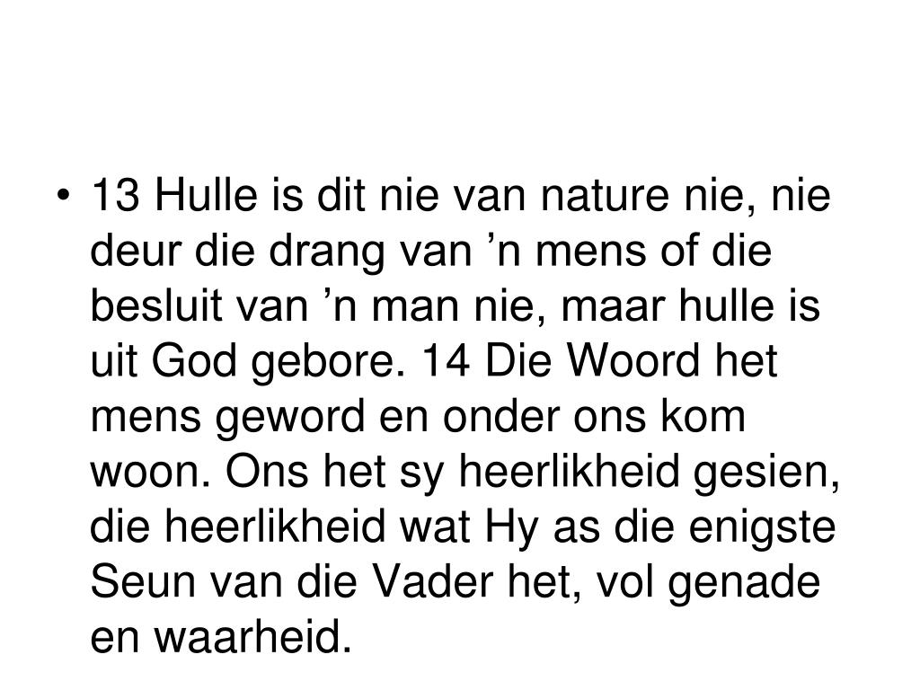 13 Hulle is dit nie van nature nie, nie deur die drang van ’n mens of die besluit van ’n man nie, maar hulle is uit God gebore. 14 Die Woord het mens geword en onder ons kom woon. Ons het sy heerlikheid gesien, die heerlikheid wat Hy as die enigste Seun van die Vader het, vol genade en waarheid.