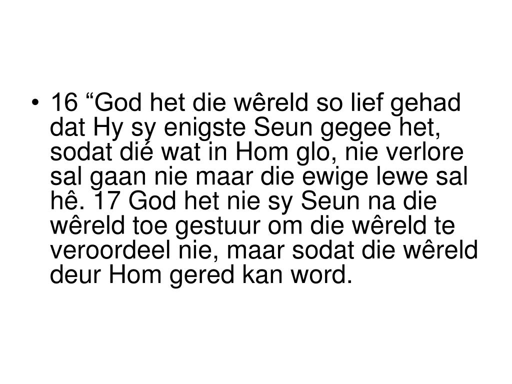 16 “God het die wêreld so lief gehad dat Hy sy enigste Seun gegee het, sodat dié wat in Hom glo, nie verlore sal gaan nie maar die ewige lewe sal hê. 17 God het nie sy Seun na die wêreld toe gestuur om die wêreld te veroordeel nie, maar sodat die wêreld deur Hom gered kan word.