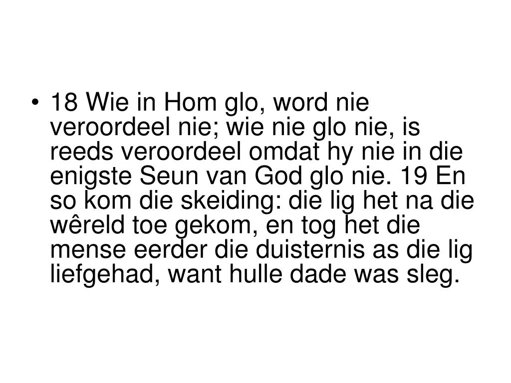 18 Wie in Hom glo, word nie veroordeel nie; wie nie glo nie, is reeds veroordeel omdat hy nie in die enigste Seun van God glo nie. 19 En so kom die skeiding: die lig het na die wêreld toe gekom, en tog het die mense eerder die duisternis as die lig liefgehad, want hulle dade was sleg.