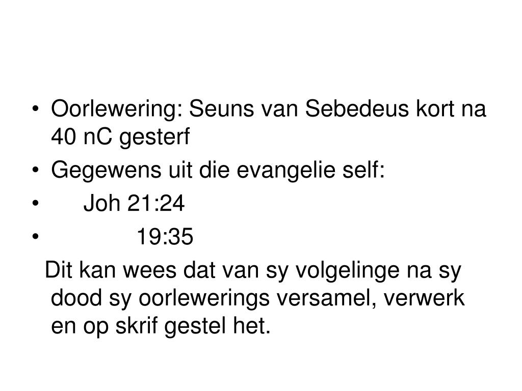 Oorlewering: Seuns van Sebedeus kort na 40 nC gesterf • Gegewens uit die evangelie self: • Joh 21:24 • 19:35 Dit kan wees dat van sy volgelinge na sy dood sy oorlewerings versamel, verwerk en op skrif gestel het.