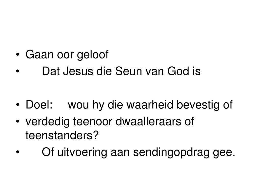 Gaan oor geloof • Dat Jesus die Seun van God is • Doel: wou hy die waarheid bevestig of • verdedig teenoor dwaalleraars of teenstanders? • Of uitvoering aan sendingopdrag gee.