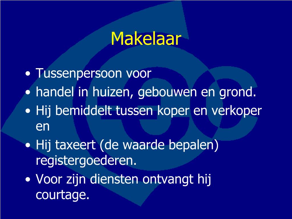 Makelaar • Tussenpersoon voor • handel in huizen, gebouwen en grond. • Hij bemiddelt tussen koper en verkoper en • Hij taxeert (de waarde bepalen) registergoederen. • Voor zijn diensten ontvangt hij courtage.