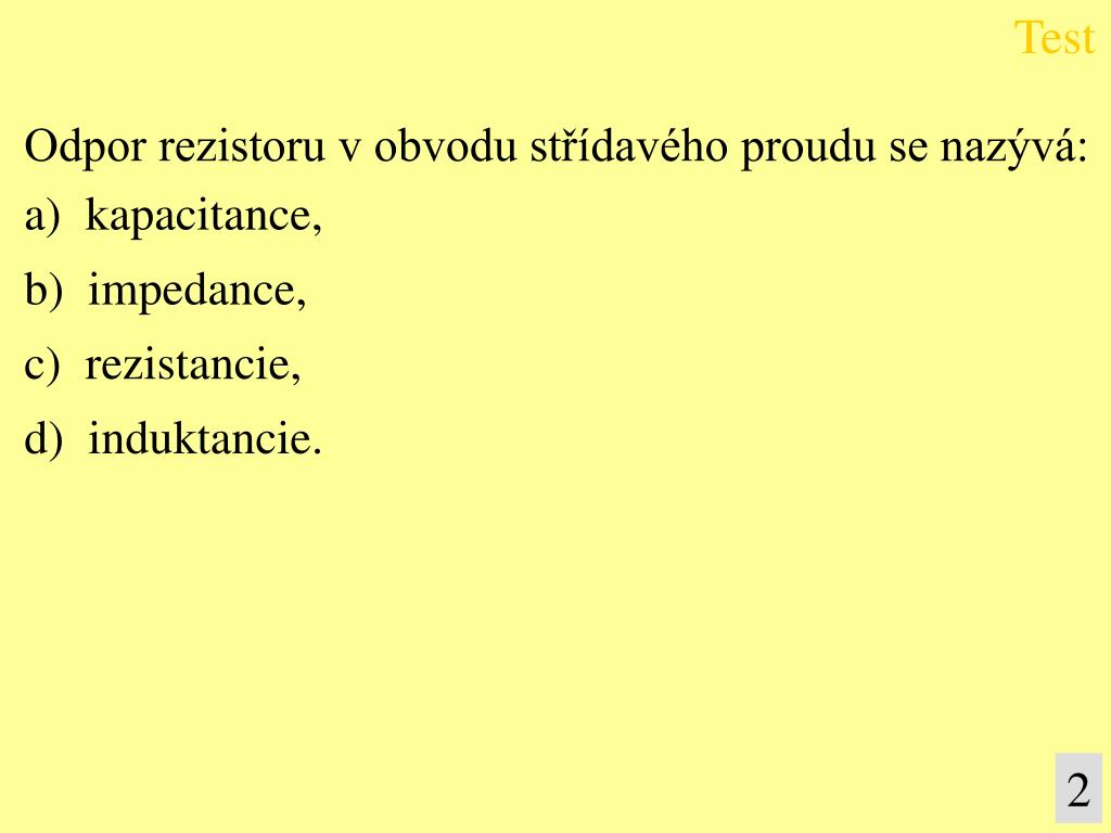 Test Odpor rezistoru v obvodu střídavého proudu se nazývá: a) kapacitance, b) impedance, c) rezistancie, d) induktancie. 2