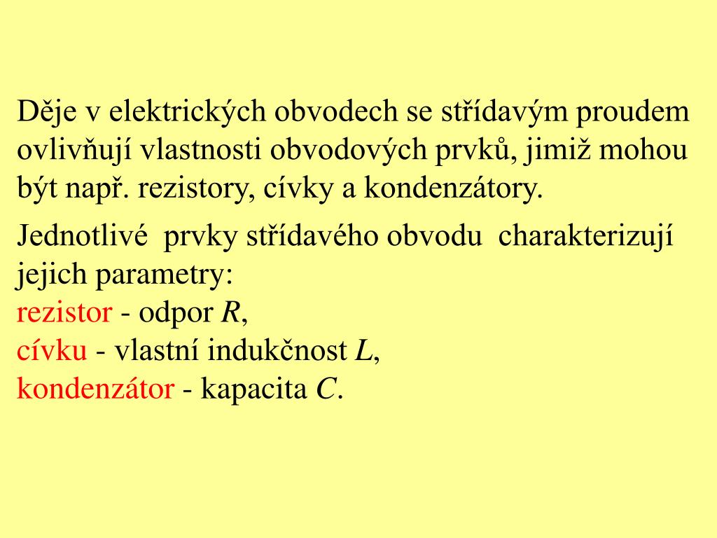 Děje v elektrických obvodech se střídavým proudem ovlivňují vlastnosti obvodových prvků, jimiž mohou být např. rezistory, cívky a kondenzátory. Jednotlivé prvky střídavého obvodu charakterizují jejich parametry: rezistor - odpor R, cívku - vlastní indukčnost L, kondenzátor - kapacita C.