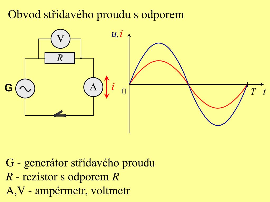 u,i V t 0 Obvod střídavého proudu s odporem A G G - generátor střídavého proudu R - rezistor s odporem R A,V - ampérmetr, voltmetr