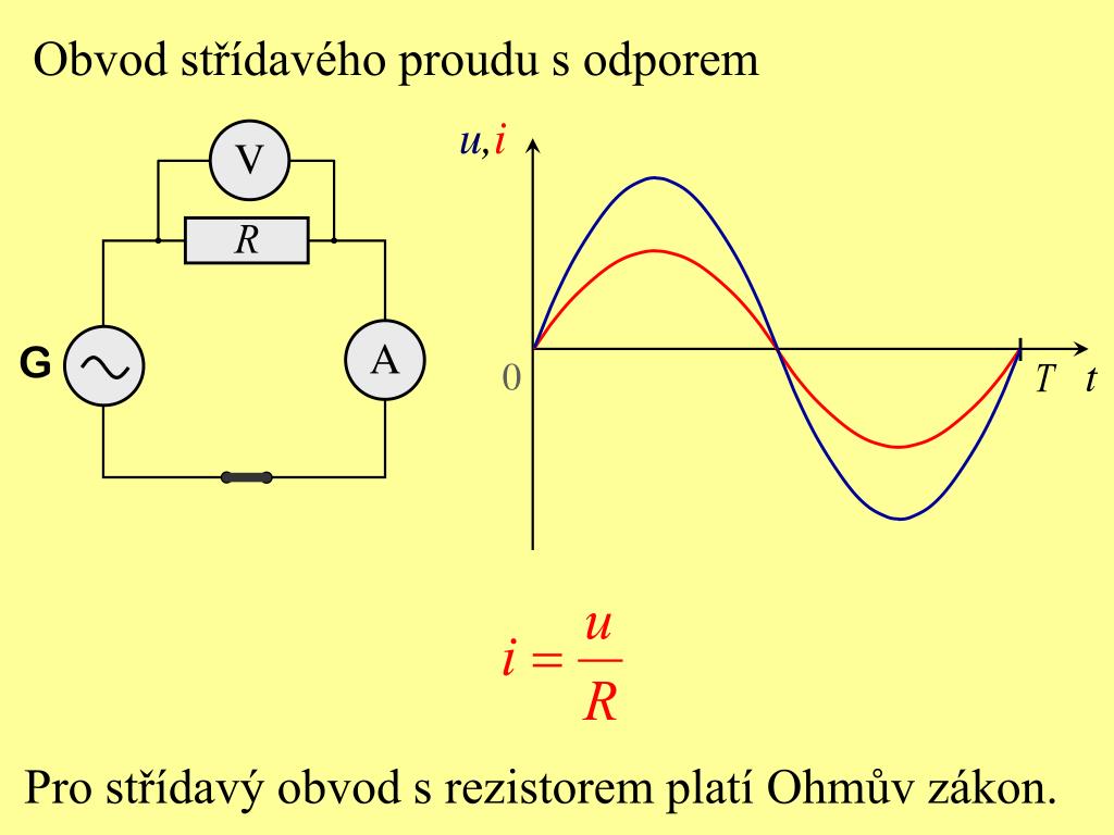 u,i V A G t 0 Obvod střídavého proudu s odporem Pro střídavý obvod s rezistorem platí Ohmův zákon.