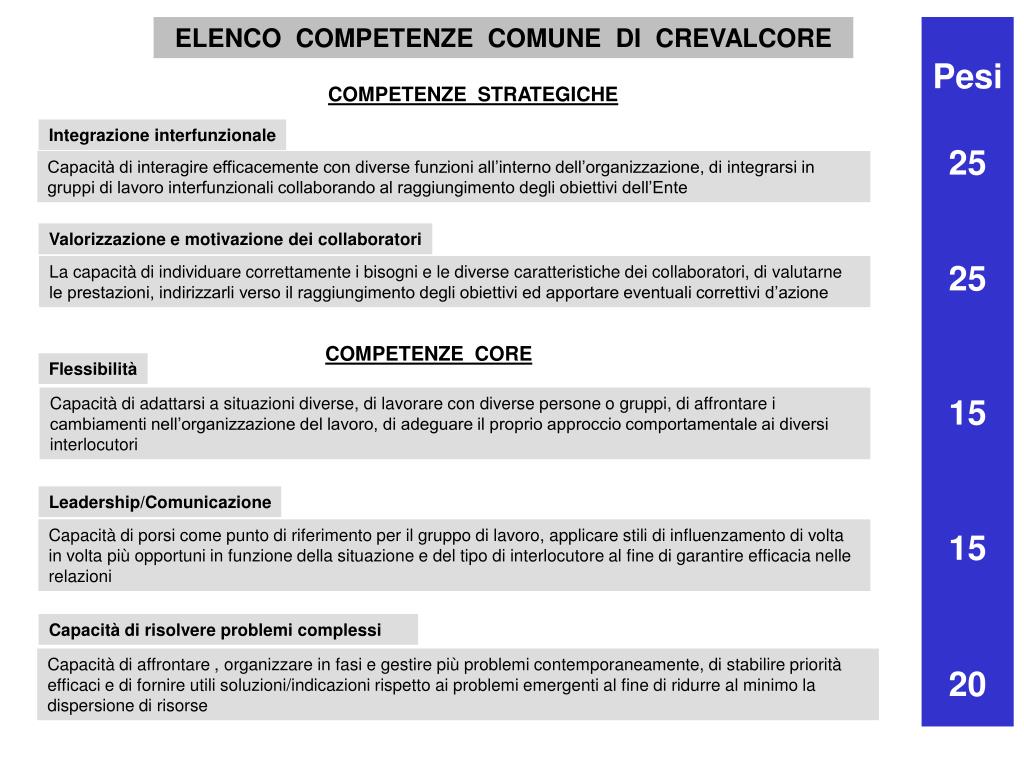 PESI e COMPETENZE ANNO………. ELENCO COMPETENZE COMUNE DI CREVALCORE. Pesi 25 25 15 15 20. COMPETENZE STRATEGICHE. Integrazione interfunzionale.