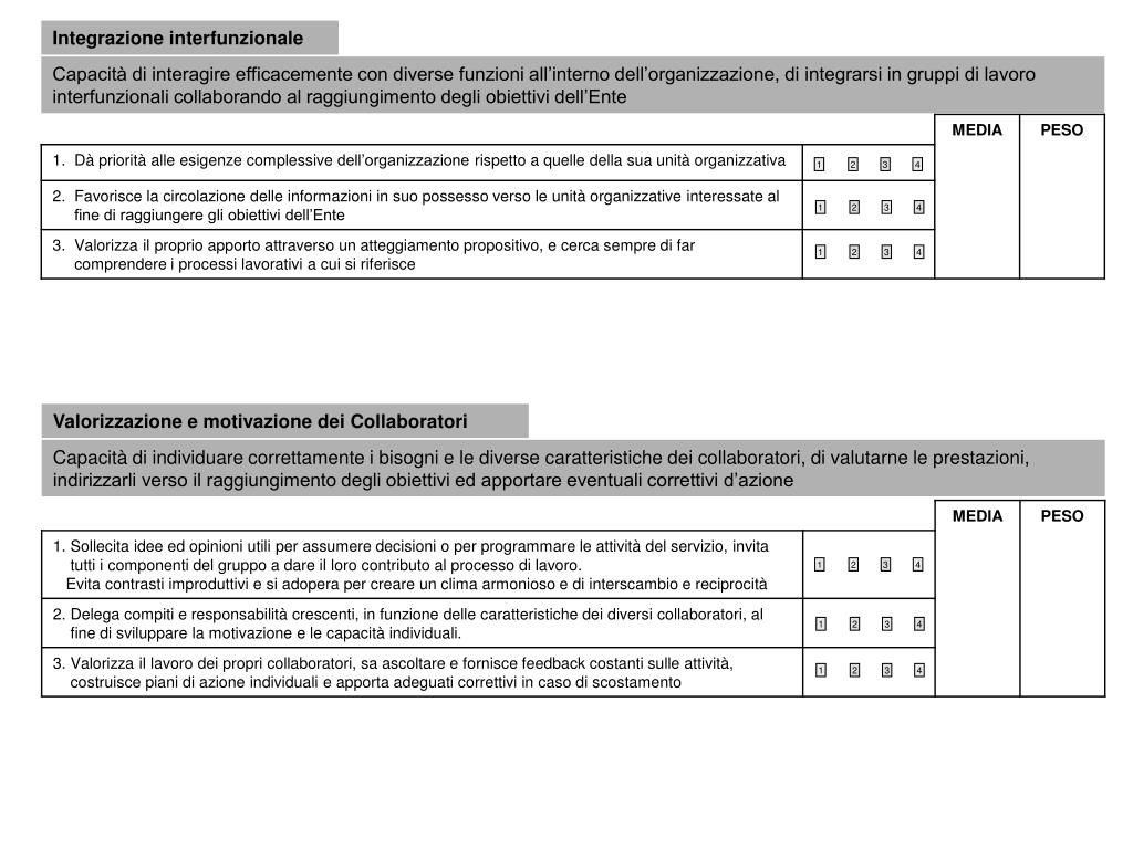 Integrazione interfunzionale Capacità di interagire efficacemente con diverse funzioni all’interno dell’organizzazione, di integrarsi in gruppi di lavoro interfunzionali collaborando al raggiungimento degli obiettivi dell’Ente 1 2 3 4 1 2 3 4 1 2 3 4 Valorizzazione e motivazione dei Collaboratori Capacità di individuare correttamente i bisogni e le diverse caratteristiche dei collaboratori, di valutarne le prestazioni, indirizzarli verso il raggiungimento degli obiettivi ed apportare eventuali correttivi d’azione 1 2 3 4 1 2 3 4 1 2 3 4