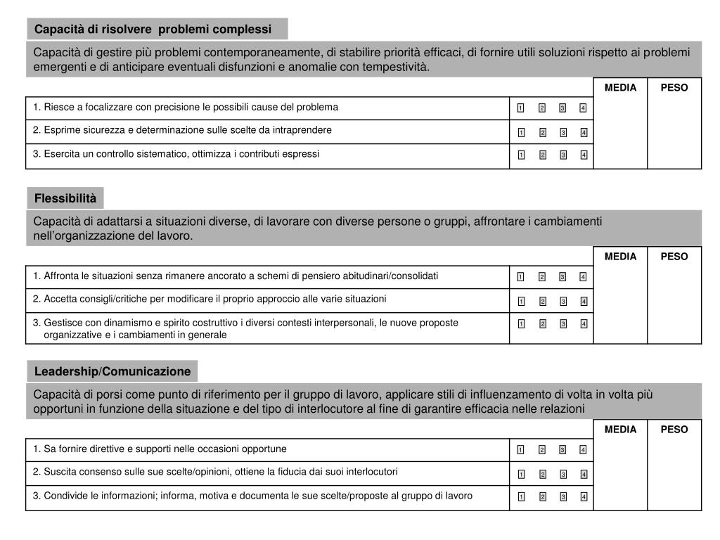 Capacità di risolvere problemi complessi Capacità di gestire più problemi contemporaneamente, di stabilire priorità efficaci, di fornire utili soluzioni rispetto ai problemi emergenti e di anticipare eventuali disfunzioni e anomalie con tempestività. 1 2 3 4 1 2 3 4 1 2 3 4 Flessibilità Capacità di adattarsi a situazioni diverse, di lavorare con diverse persone o gruppi, affrontare i cambiamenti nell’organizzazione del lavoro. 1 2 3 4 1 2 3 4 1 2 3 4 Leadership/Comunicazione Capacità di porsi come punto di riferimento per il gruppo di lavoro, applicare stili di influenzamento di volta in volta più opportuni in funzione della situazione e del tipo di interlocutore al fine di garantire efficacia nelle relazioni 1 2 3 4 1 2 3 4 1 2 3 4