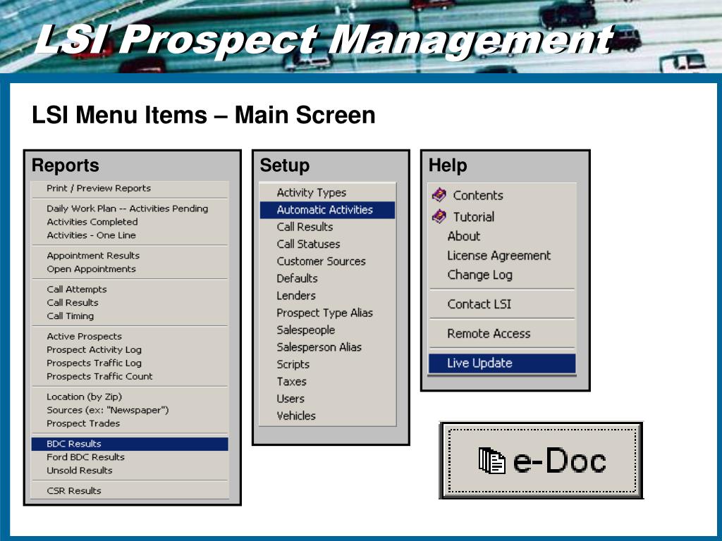 LSI PROSPECT MANAGEMENT • Marketing & Advertising • Business Development Center (BDC) • ConsumerTRAC • Competitive Advertising Database • Dealer Direct • FordDirect • Ford Dealer Toolbox • FCSD Marketing Central • Retail Trade Cycle Management • more Marketing & Advertising
