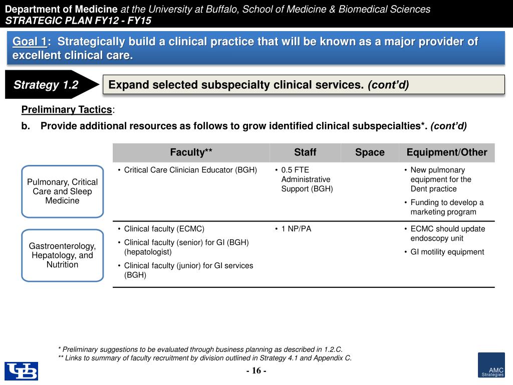 Goal 1: Strategically build a clinical practice that will be known as a major provider of excellentclinical care. Strategy 1.3 Cultivate a strong network of primary care and specialty practices. • Preliminary Tactics: • Explore various options to expand general medicine and medicine-pediatric primary care base: • Develop innovative approaches to recruit new General Internal Medicine faculty given persistent workforce shortages. • Expand the use of mid-level providers. • Develop an affiliate network. • Identify potential practices that would be interested in affiliation. • Examine other successful models employed elsewhere. • Offer practice management services and access to EMR. • Develop a Federally-Qualified Health Center (FQHC) run by the Department. • Collaborate with other UB departments that offer primary care services.