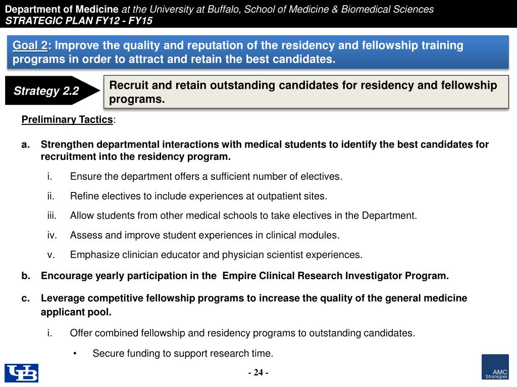 Goal 2: Improve the quality and reputation of the residency and fellowship training programs in order to attract and retain the best candidates. Recruit and retain outstanding candidates for residency and fellowship programs. Strategy 2.2 • Preliminary Tactics: • Strengthen departmental interactions with medical students to identify the best candidates for recruitment into the residency program. • Ensure the department offers a sufficient number of electives. • Refine electives to include experiences at outpatient sites. • Allow students from other medical schools to take electives in the Department. • Assess and improve student experiences in clinical modules. • Emphasize clinician educator and physician scientist experiences. • Encourage yearly participation in the Empire Clinical Research Investigator Program. • Leverage competitive fellowship programs to increase the quality of the general medicine applicant pool. • Offer combined fellowship and residency programs to outstanding candidates. • Secure funding to support research time.