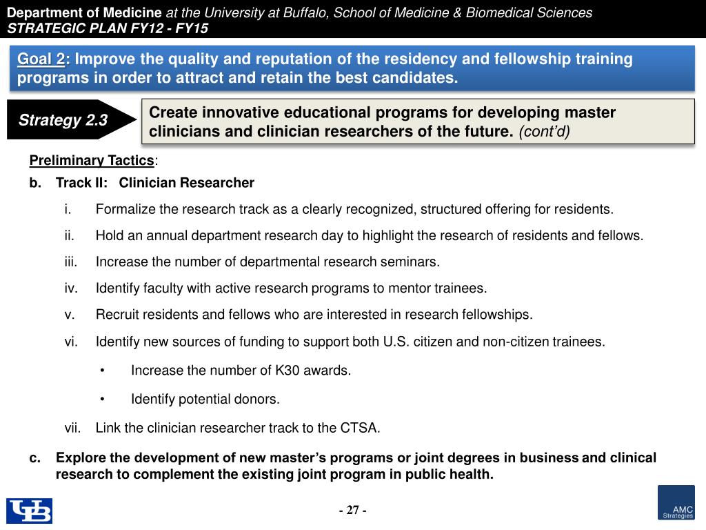 Goal 2: Improve the quality and reputation of the residency and fellowship training programs in order to attract and retain the best candidates. • Create innovative educational programs for developing master clinicians and clinician researchers of the future. Strategy 2.3 • Preliminary Tactics: • Track I: Master Clinician • Develop a curriculum for master clinicians to emphasize broad-based clinical skills in outpatient and inpatient medicine. • Build the ambulatory training experience around the patient-centered medical home instead of hospital-based clinics. • Evaluate existing models of successful master clinician residency programs ( e.g., University of Rochester Medical Center). • Match individual residents with faculty mentors. • Provide development opportunities to ensure that faculty are prepared to facilitate the master clinician track.