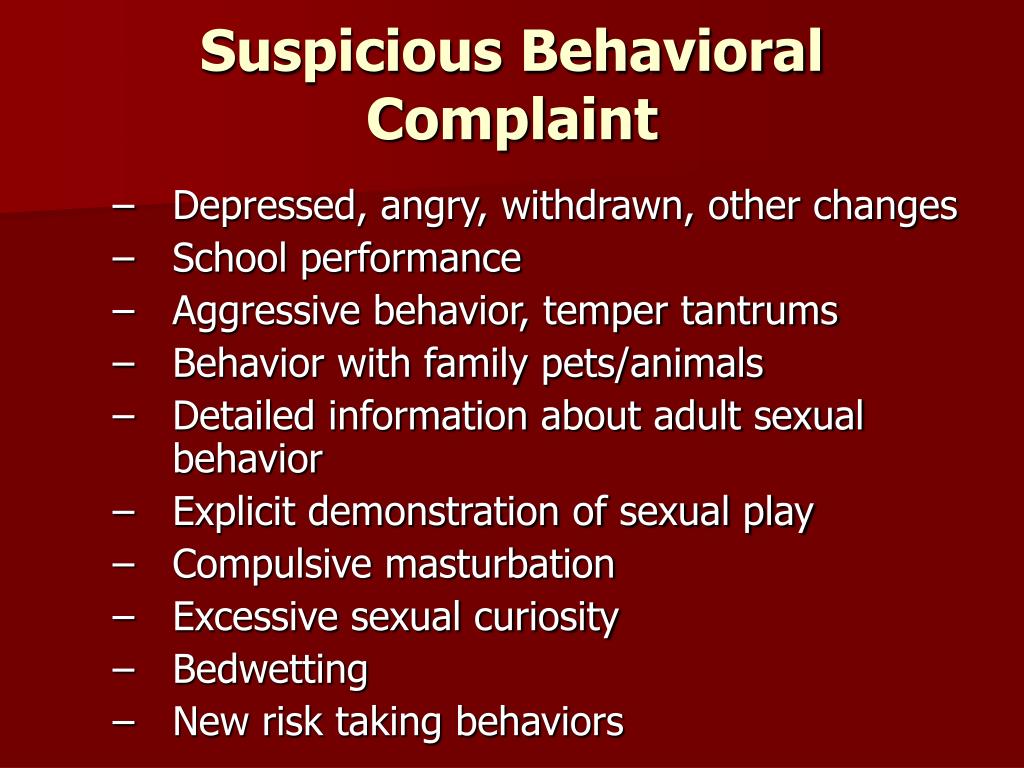 Suspicious Behavioral Complaint • Depressed, angry, withdrawn, other changes • School performance • Aggressive behavior, temper tantrums • Behavior with family pets/animals • Detailed information about adult sexual behavior • Explicit demonstration of sexual play • Compulsive masturbation • Excessive sexual curiosity • Bedwetting • New risk taking behaviors