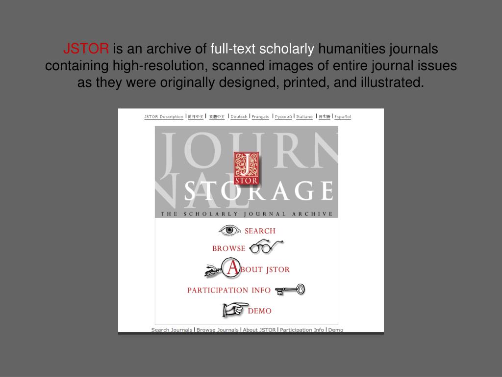 JSTOR is an archive of full-text scholarly humanities journals containing high-resolution, scanned images of entire journal issues as they were originally designed, printed, and illustrated.