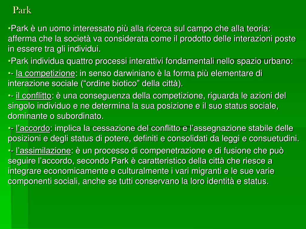 Park Park è un uomo interessato più alla ricerca sul campo che alla teoria: afferma che la società va considerata come il prodotto delle interazioni poste in essere tra gli individui. Park individua quattro processi interattivi fondamentali nello spazio urbano: - la competizione: in senso darwiniano è la forma più elementare di interazione sociale (“ordine biotico” della città). - il conflitto: è una conseguenza della competizione, riguarda le azioni del singolo individuo e ne determina la sua posizione e il suo status sociale, dominante o subordinato. - l’accordo: implica la cessazione del conflitto e l’assegnazione stabile delle posizioni e degli status di potere, definiti e consolidati da leggi e consuetudini. - l’assimilazione: è un processo di compenetrazione e di fusione che può seguire l’accordo, secondo Park è caratteristico della città che riesce a integrare economicamente e culturalmente i vari migranti e le sue varie componenti sociali, anche se tutti conservano la loro identità e status.