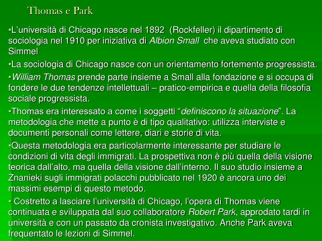 Thomas e Park L’università di Chicago nasce nel 1892 (Rockfeller) il dipartimento di sociologia nel 1910 per iniziativa di AlbionSmall che aveva studiato con Simmel La sociologia di Chicago nasce con un orientamento fortemente progressista. William Thomas prende parte insieme a Small alla fondazione e si occupa di fondere le due tendenze intellettuali – pratico-empirica e quella della filosofia sociale progressista. Thomas era interessato a come i soggetti “definiscono la situazione”. La metodologia che mette a punto è di tipo qualitativo: utilizza interviste e documenti personali come lettere, diari e storie di vita. Questa metodologia era particolarmente interessante per studiare le condizioni di vita degli immigrati. La prospettiva non è più quella della visione teorica dall’alto, ma quella della visione dall’interno. Il suo studio insieme a Znanieki sugli immigrati polacchi pubblicato nel 1920 è ancora uno dei massimi esempi di questo metodo. Costretto a lasciare l’università di Chicago, l’opera di Thomas viene continuata e sviluppata dal suo collaboratore Robert Park, approdato tardi in università e con un passato da cronista investigativo. Anche Park aveva frequentato le lezioni di Simmel.