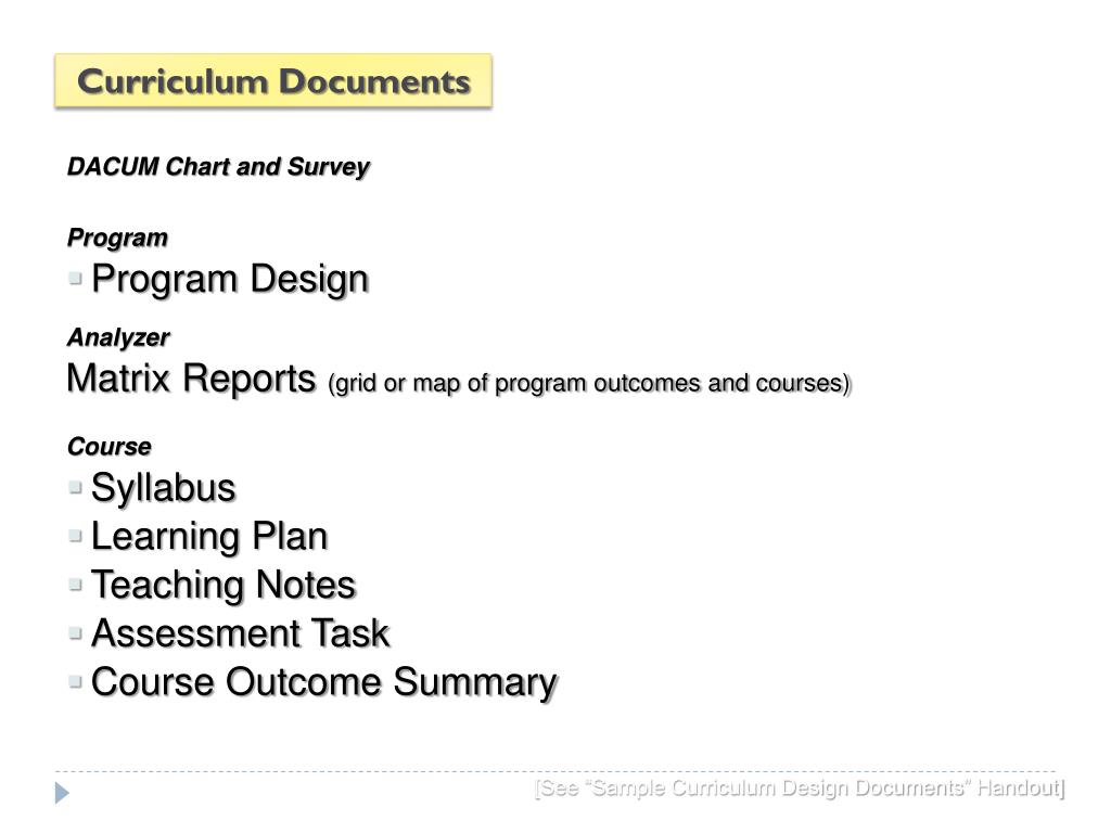 Curriculum Documents DACUM Chart and Survey Program • Program Design Analyzer Matrix Reports (grid or map of program outcomes and courses) Course • Syllabus • Learning Plan • Teaching Notes • Assessment Task • Course Outcome Summary [See “Sample Curriculum Design Documents” Handout]
