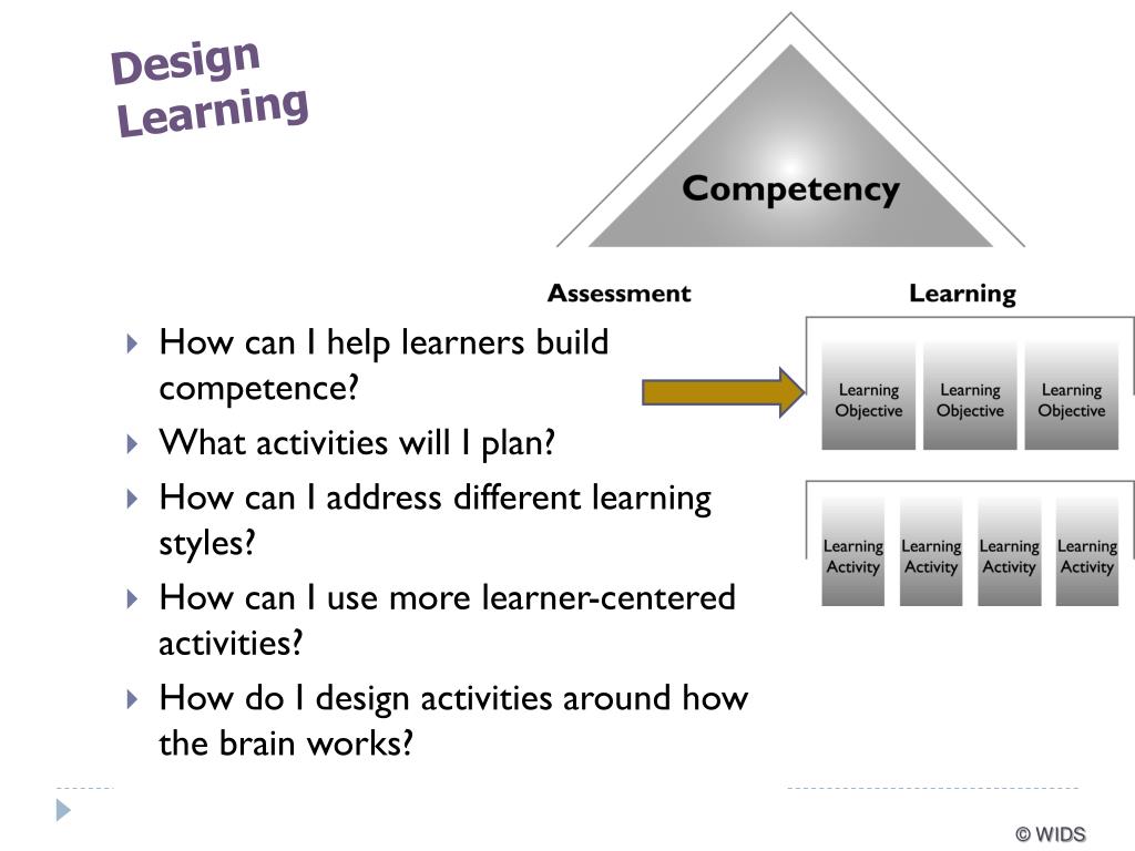 Design Learning • How can I help learners build competence? • What activities will I plan? • How can I address different learning styles? • How can I use more learner-centered activities? • How do I design activities around how the brain works? © WIDS