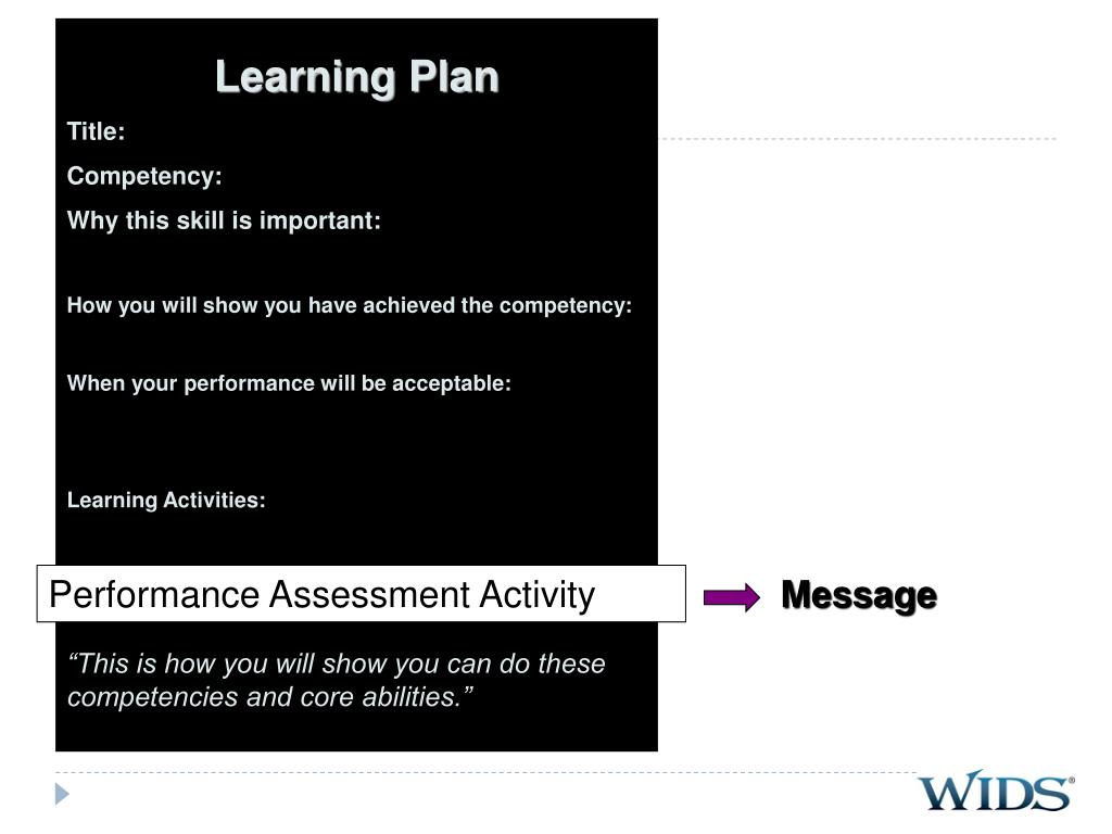 Learning Plan Title: Competency: Why this skill is important: How you will show you have achieved the competency: When your performance will be acceptable: Learning Activities: “This is how you will show you can do these competencies and core abilities.” Performance Assessment Activity Message