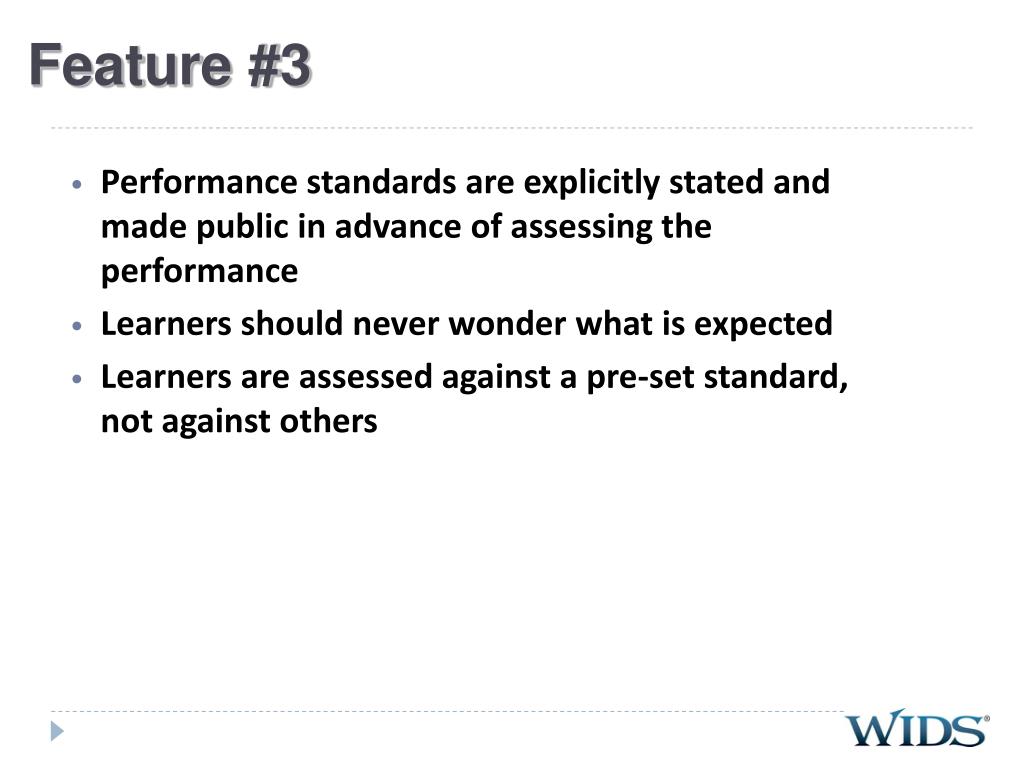 Feature #3 • Performance standards are explicitly stated and made public in advance of assessing the performance • Learners should never wonder what is expected • Learners are assessed against a pre-set standard, not against others