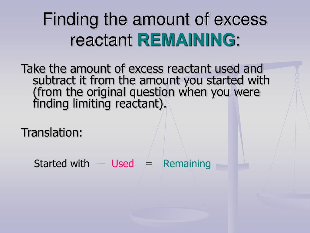Finding the amount of excess reactant REMAINING: Take the amount of excess reactant used and subtract it from the amount you started with (from the original question when you were finding limiting reactant). Translation: Started with Used = Remaining