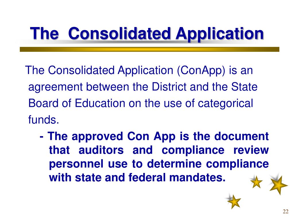 The Consolidated Application The Consolidated Application (ConApp) is an agreement between the District and the State Board of Education on the use of categorical funds. - The approved Con App is the document that auditors and compliance review personnel use to determine compliance with state and federal mandates.