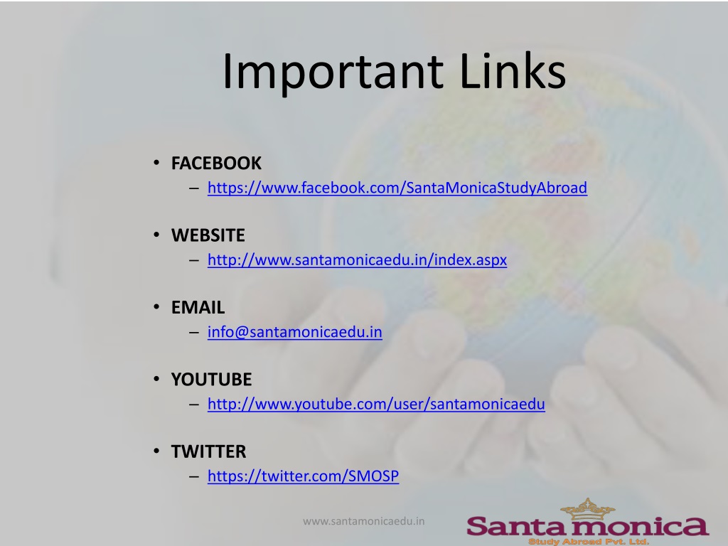Important Links • FACEBOOK • https://www.facebook.com/SantaMonicaStudyAbroad • WEBSITE • http://www.santamonicaedu.in/index.aspx • EMAIL • info@santamonicaedu.in • YOUTUBE • http://www.youtube.com/user/santamonicaedu • TWITTER • https://twitter.com/SMOSP www.santamonicaedu.in