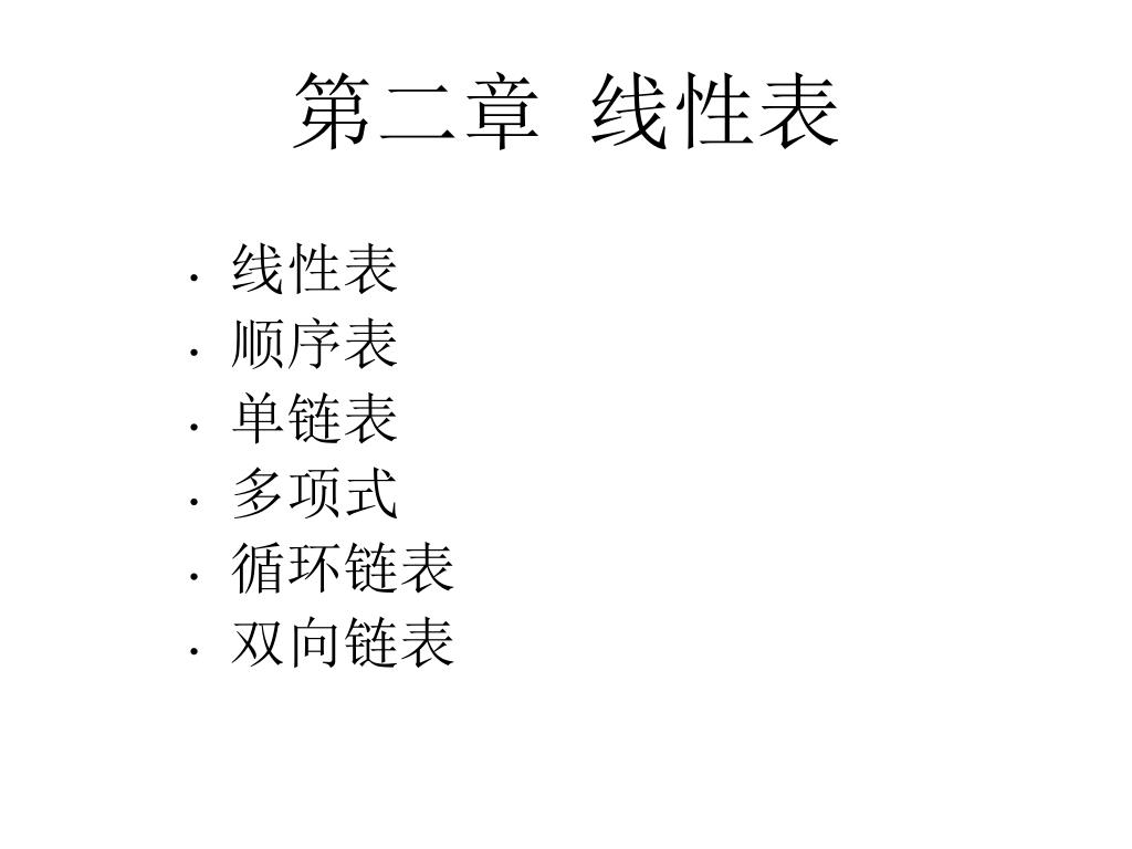 第二章 线性表 • 线性表 • 顺序表 • 单链表 • 多项式 • 循环链表 • 双向链表